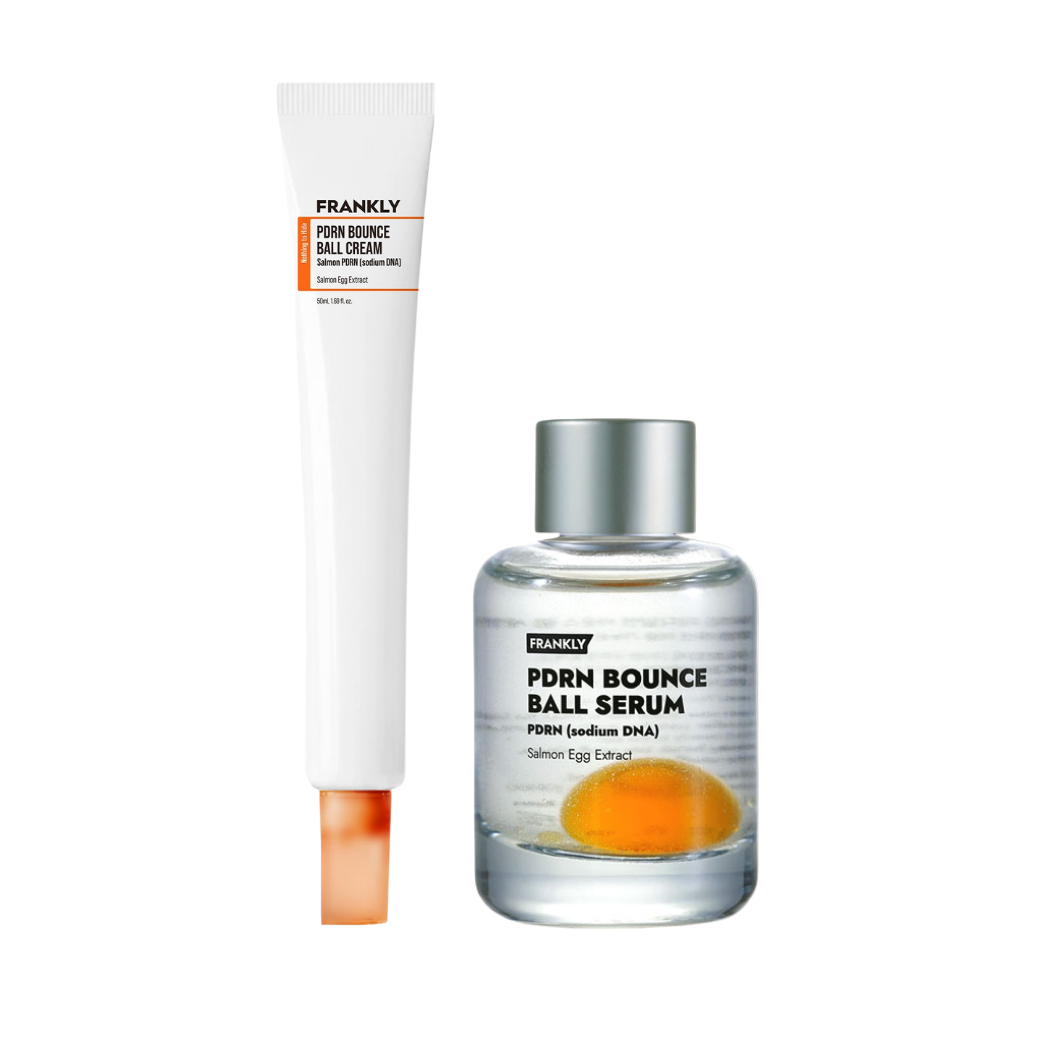 Frankly PDRN Bounce Ball Recovery Duo, cildin nem, dolgunluk ve elastikiyet ihtiyacını birlikte hedefleyen serum + krem adımlarından oluşan tamamlayıcı antioksidan ve antiaging bakım setidir.